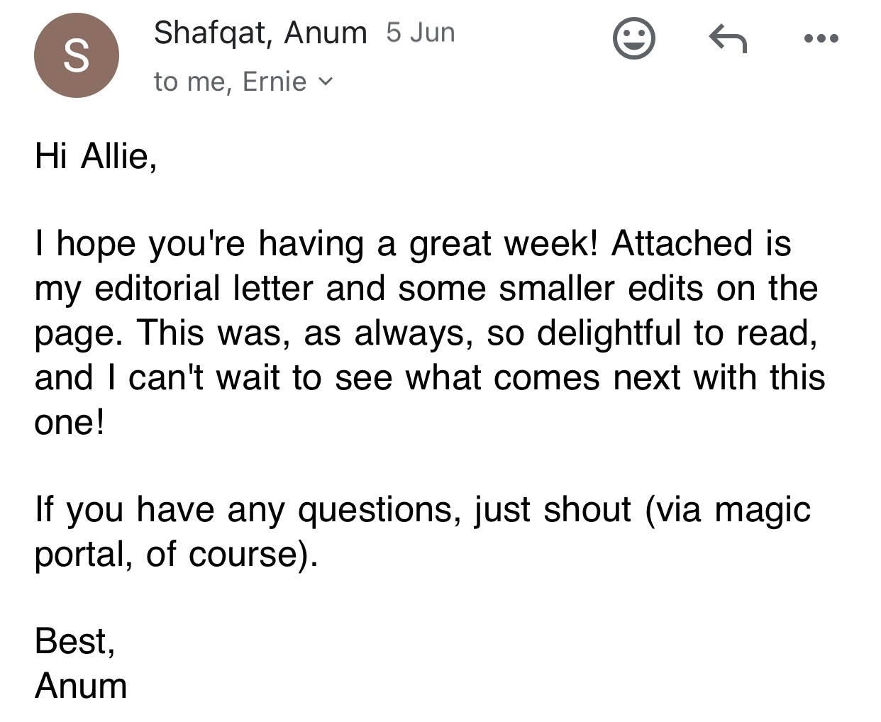The letter was six pages long and covered everything from plot and worldbuilding to characters, the magic system, and relationships. Before that, I’d already sent my editor a document with my thoughts and ideas for this round and she made sure to respond to all of them in her letter.